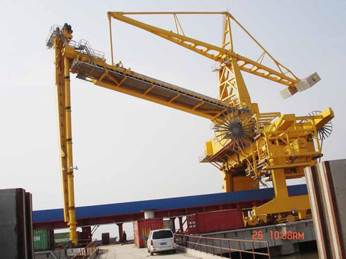 的軌道行走,它利用行走、回轉、俯仰、擺動各動作的配合對海船貨艙進行。卸出的物料除卸至與碼頭岸線平行的上外,也可轉載到能繞門架端部鉸點俯仰的上,直接將物料送至堆場。