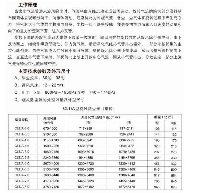 CLT/A型旋風除塵器有單筒,雙筒,三筒,六筒等五種組合。單筒體積和蝸殼可能成右旋轉和左旋轉兩種形式,每種組合有兩種出風形式:Ⅰ型水平出風和Ⅱ型(上部出風)。CLT/A型旋風除塵器可用于物質比較重大的干燥的非纖維灰塵,通用于冶煉、鑄造、噴砂、建筑材料、水泥、耐火材料等工業中。