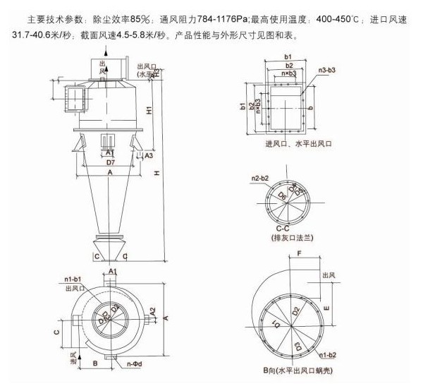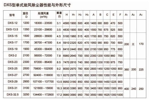 DXS型旋風除塵器由螺旋外殼、底部錐斗和穩定器、頂部出風蝸殼等部分組成,用戶自配鎖風配置,進出口和出風口方向,可按用戶要求制成順時針旋轉(S型)或逆時針(N型),若用戶要求垂直向上出風時,可取消頂部出風蝸殼。
